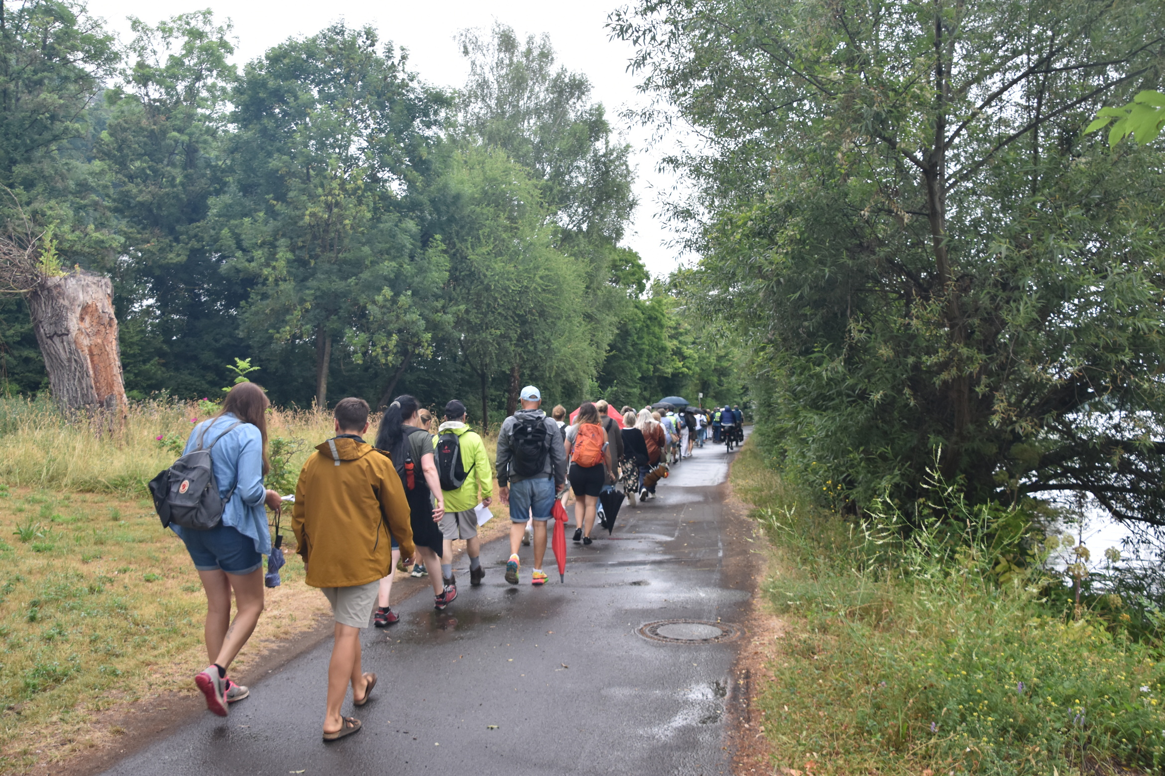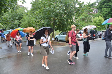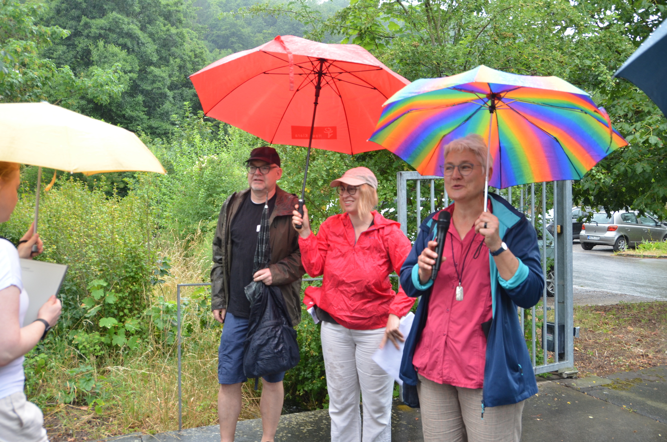 Obwohl Regenschauer pünktlich zum Auftakt der Wallfahrt um 9.30 Uhr einsetzten, trübte das keineswegs die vorfreudige Stimmung auf den anstehenden Tag und das Wiedersehen der Teilnehmerinnen und Teilnehmer. „Wir sind mit Schirmen und Regenjacken gut ausgerüstet“, erklärte eine Kollegin aus dem DiCV. Nach der starken Hitze des Vortages wurde der Regen von oben daher vielen sogar zur Wohltat. Für die, die keinen Schirm dabeihatten, gab es zudem eine schnelle Lösung: Franziskanerschwester Katherina Ganz lief umgehend ins Kloster zurück und verteilte anschließend geeigneten, bunten Regenschutz an diejenigen, die keinen Schirm dabeihatten.