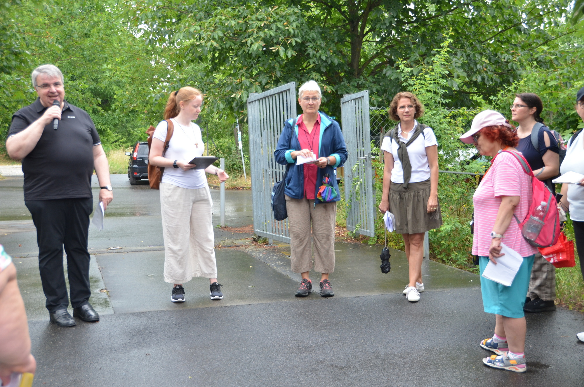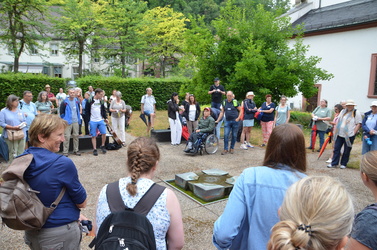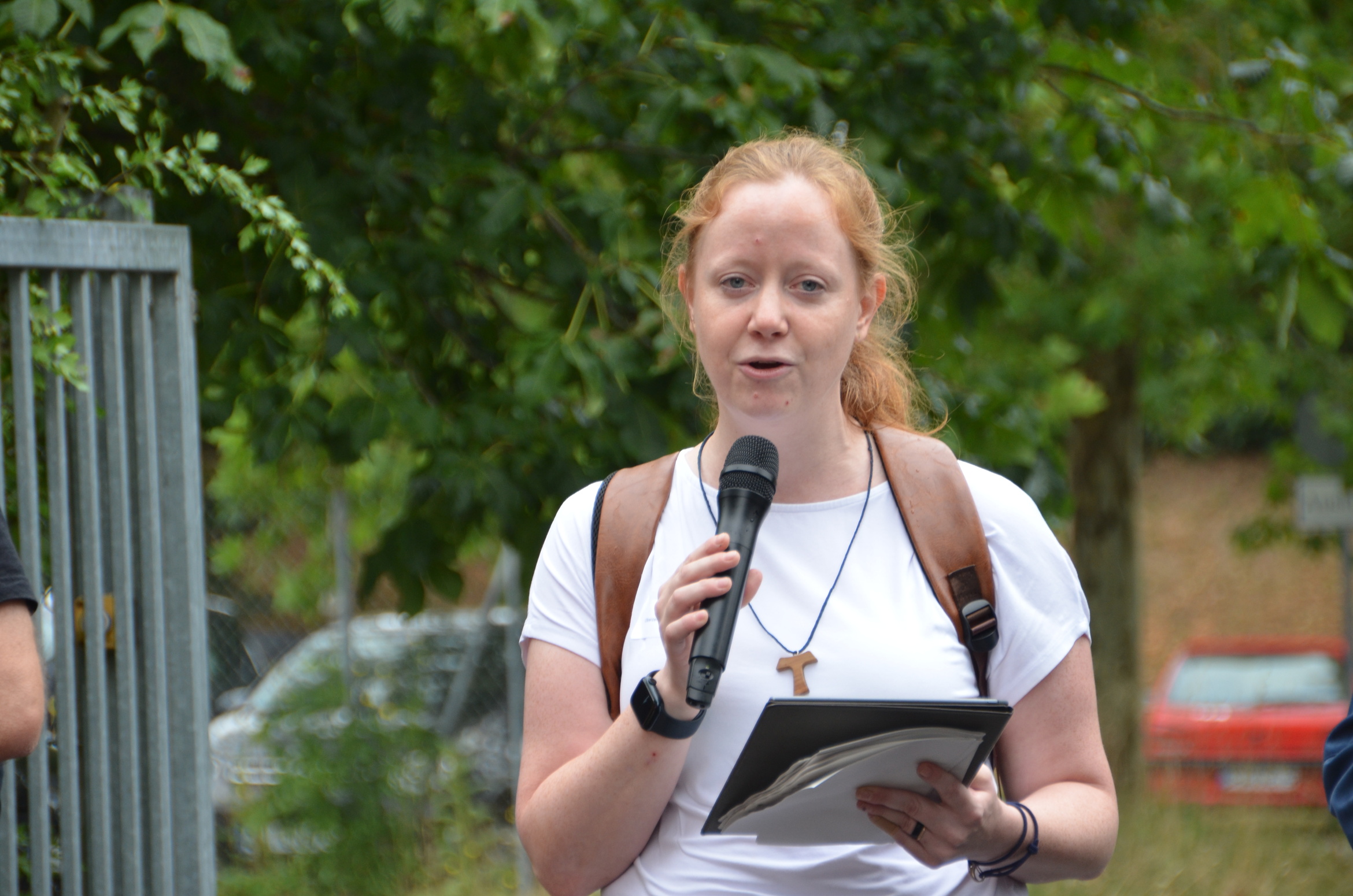 Mit Blick auf das Leben von Ordensgründerin Antonia Werr, die sich Zeit ihres Lebens für Frauen in schwierigen Lebenssituationen einsetzte, lenkte Sr. Philippa den Blick der AGkE-Wallfahrer an der ersten Station auf die vor ihnen liegende Ruine. „Es gilt, sich dem Trümmerhaufen zuzuwenden, seinen Wert zu erkennen, diesen wieder neu zuzusprechen und sichtbar zu machen“, so die Oberzeller Franziskanerin. So wie Antonia Werr es einst getan hatte, lud sie die Teilnehmenden dazu ein, in Kontakt mit dem Zerbrochenen zu gehen und deren vermeintlich unentdeckte Schönheit zu erkennen. Dieses Bild übertrug sie gleichsam auf die Arbeit der Menschen aus der Kinder- und Jugendhilfe, die tagtäglich mit besonderen Schicksalen konfrontiert seien und dennoch das Beste daraus machen. Bevor es zur nächsten Station ging, waren alle eingeladen, sich einen Stein auf den Weg mitzunehmen und damit „auf Tuchfühlung mit dem Zerbrochenen zu gehen“.