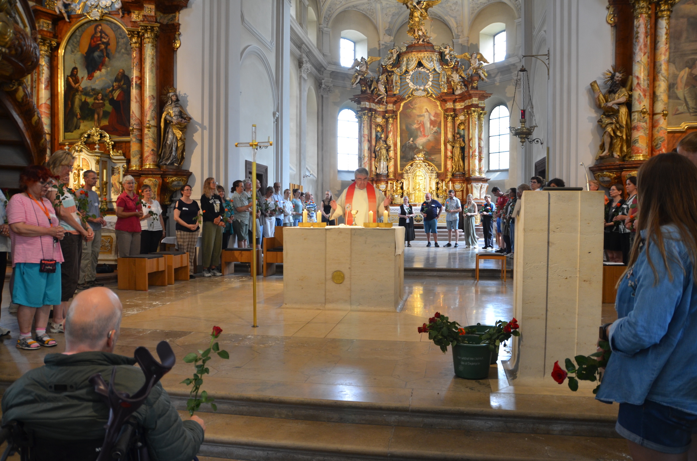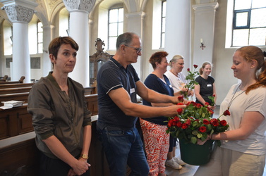 Als Dank und um noch mehr miteinander in Berührung zu kommen, beschenkten sich die Gottesdienstbesucher diesem Aufruf folgenden anschließend gegenseitig mit blühenden Rosen, die Sr. Philippa und AGkE-Geschäftsführerin Sabrina Göpfert zuvor an alle verteilt hatten.