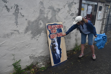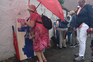 Zweite Station war die ehemalige Mühle in Zell als Symbol für Reinigung, Verwandlung und Erneuerung. Nun kam der Stein aus der Ruine zum Einsatz. Auf vorbereiteten Holzplatten war zunächst nur blaue Farbe zu sehen. Mit ihrem Stein sollten alle Teilnehmer diese Farbe abkratzen – hervor kam ein Bild von Antonia Werr sowie ermutigende Worte als Gedankenanstoß, im eigenen Leben auch etwas zuzulassen und etwas im Inneren, im Leben freizulegen, was verborgen oder verschüttet, vielleicht auch noch nie offensichtlich war, nie hervortreten konnte oder durfte. „Doch du liebst mich, du lässt mich nicht los. Vater, du wirst bei mir sein‘, diese Zeile aus dem Lied ‚Meine Zeit steht in deinen Händen‘ zeigt die Kraft, mit der unsere innere Mühle angetrieben wird“, so Sr. Philippa an dieser Station. Auch Antonia Werr habe diese Kraft gebraucht. „Der Herr, der Starke, wird mit mir sein und für mich wider alle meine Feinde kämpfen“ heißt es weiter in dem Lied und diese Gewissheit habe sie bei der Entdeckung und Umsetzung ihrer Berufung genauso wie bei Übersetzung ihres Glaubens in glaubwürdiges Handeln getragen.
