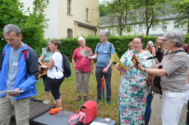 Nach einer herzlichen Begrüßung durch AGkE-Geschäftsführerin Sabrina Göpfert und Schwester Philippa Haase von den Oberzeller Schwestern, die sich gemeinsam mit Christiane Holtmann, Referentin für Sozialpastoral und Engagementförderung im DiCV, und der AGkE für die spirituellen Impulse auf der Wallfahrt verantwortlich zeigte, schickte Domkapitular Clemens Bieber die Teilnehmenden mit einem Reisesegen und guten Wünschen auf die rund drei Kilometer lange Pilgerfahrt durch die Naturlandschaft rund um Kloster Oberzell. Dann zogen die Wallfahrer mit dem Lied „Brich auf, bewege dich“ zu ihrer ersten Station, dem Kloster Unterzell, los.