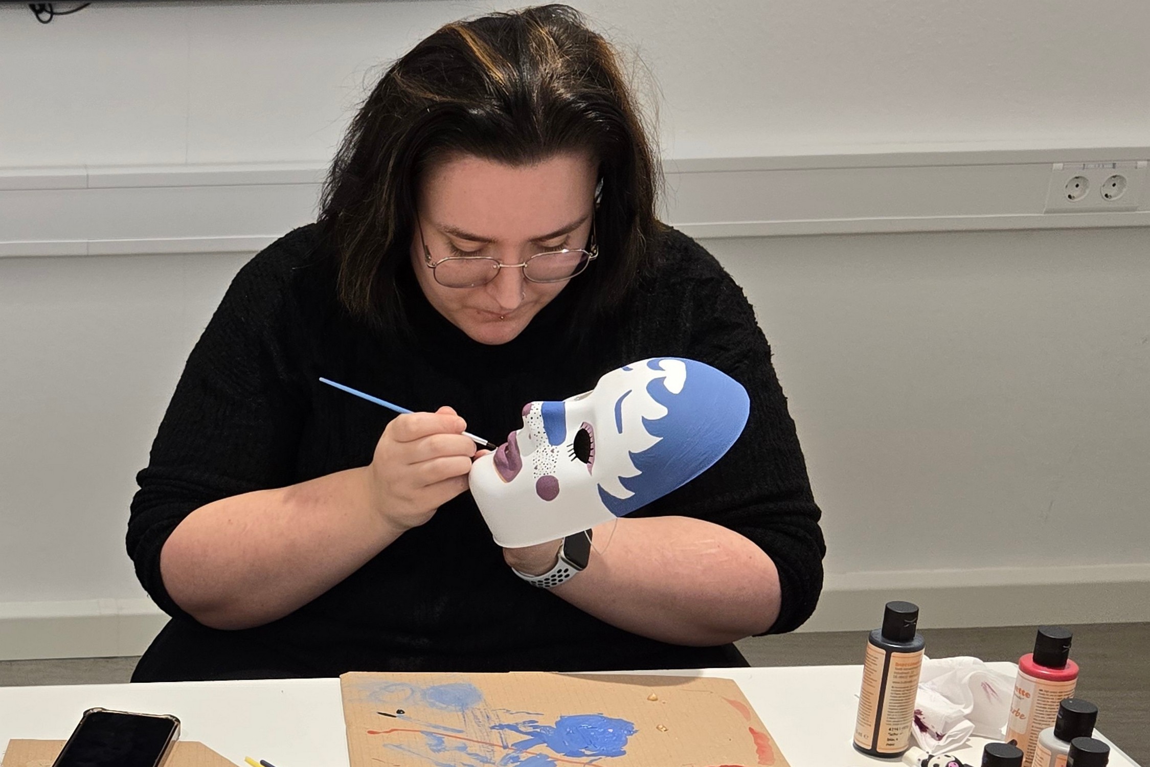 BvB-Teilnehmerin Marie Selhof freut sich nun, die von ihr gestaltete Maske mit nach Hause zu nehmen, um das Ergebnis ihrer Familie und ihren Freunden zu präsentieren.