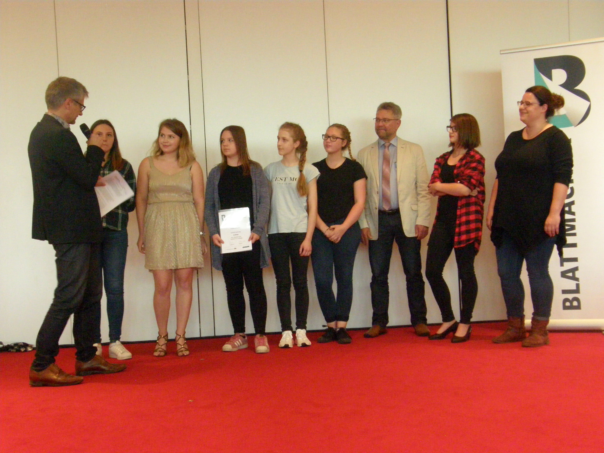 Anfang Juli erreichte die Schülerinnen die Nachricht aus München, dass ihre LUIse auch einen Preis bei „Bayerns beste Blattmacher“ erhalten werde. Am 24. Juli nahmen Schulleiter Norbert Schneider, Klassenleiterin Ulrike Husterer und Schülerinnen des Redaktionsteams den Preis im Hochhaus der Süddeutschen Zeitung in München aus der Hand von Redakteur Sebastian Beck entgegen. Der Preis wurde von Kultusministerium und SZ ausgelobt und heuer zum zwölften Mal vergeben.