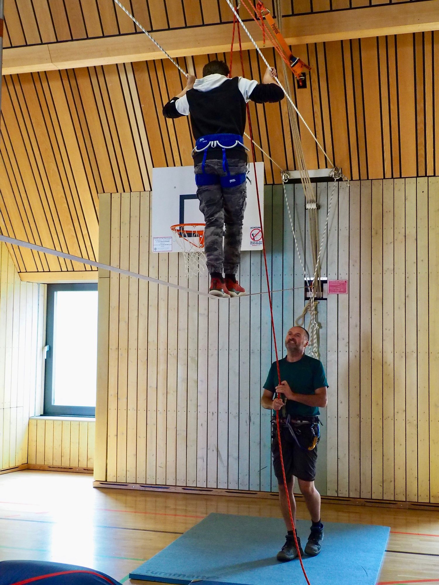 Bernd Mergler und Dieter Stabel von der Arbeitsgemeinschaft Sozialisation (AGS) boten die Möglichkeit auf einer Slackline „weit oben“ zu balancieren, mit dem Flying Fox rasant durch die Halle zu schweben und sich als Team zu bewähren, wenn jemand die freistehende Leiter erklimmt. Grenzen ermöglichen ein Mehr an Nachdenken!